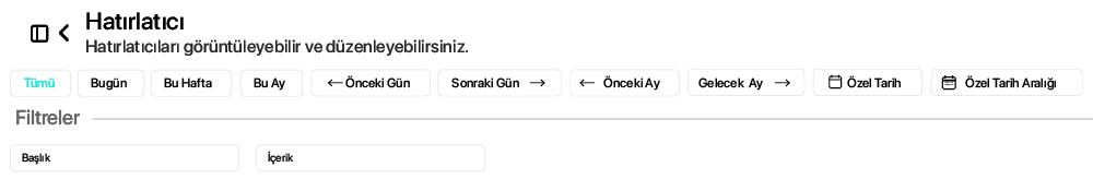 Hatırlatıcı ekranının üst bölümünde zaman bazlı filtreleme alanı bulunur. Kullanıcı burada tüm hatırlatıcıları görüntüleyebilir ya da yalnızca belirli bir tarih aralığına ait kayıtları listeleyebilir. “Tümü”, “Bugün”, “Bu Hafta”, “Bu Ay” gibi hızlı seçim butonları sayesinde tek tıkla zaman daraltması yapılabilir.