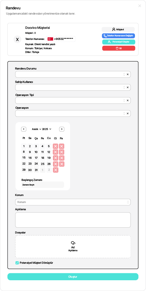 Docvivo CRM içerisinde bulunan Randevu oluşturma paneli, müşteri ile planlanan görüşmelerin veya operasyon süreçlerinin